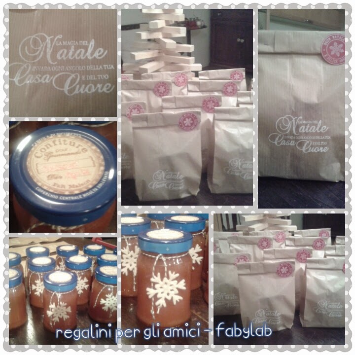 Per gli amici quest'anno un piccolo pensiero interamente fatto a mano. Quest'estate avevo fatto tantissimi vasetti di marmellata di pesche proprio per questo fine. Percio' ho confezionato i vasetti in versione natalizia con twine e fiocco di neve e realizzato l'incarto con i sacchetti per il pane timbrati con il bianco e decorati solo con un tondo di augurio.
